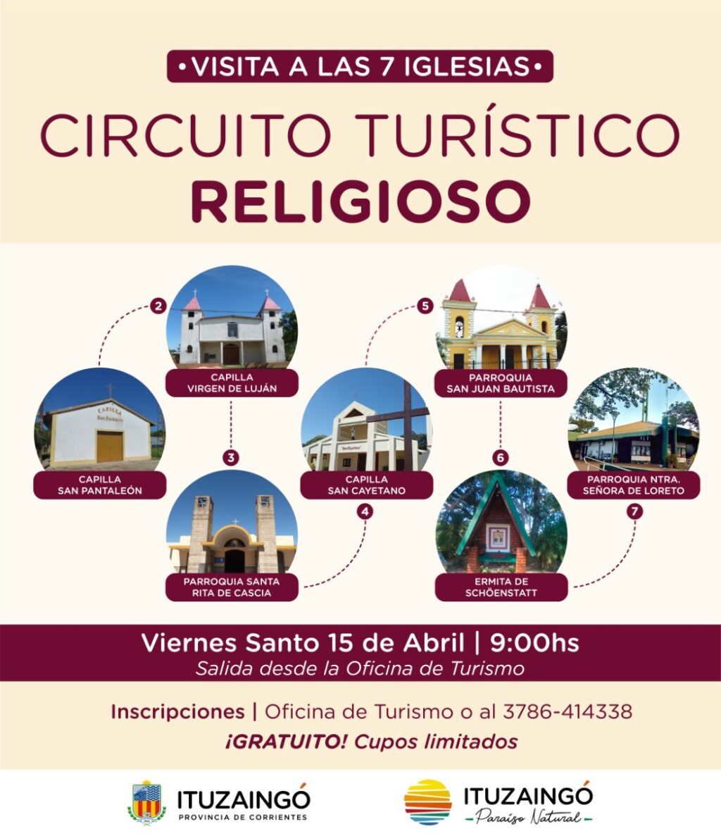 Nuestro objetivo es brindar la posibilidad de que los turistas, visitantes e ituzaingueños puedan conocer y recorrer los distintos establecimientos religiosos y acompañar a través de la oración en cada visita. Dicho circuito se realizará con técnicos en turismo de nuestra Secretaría, quienes harán un guiado gratuito, partiendo desde la Oficina de Turismo Municipal en un micro con capacidad limitada, y un tiempo de recorrido cercano a las 2horas.