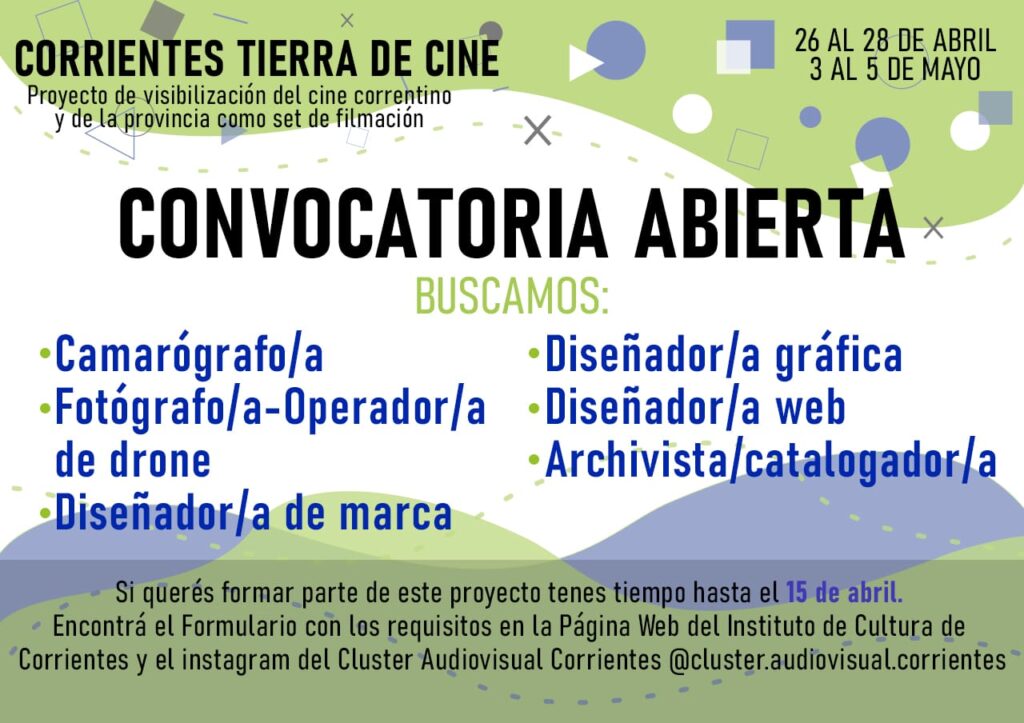 El Instituto de Cultura de Corrientes y realizadores audiovisuales autoconvocados, lanzan el proyecto “Corrientes Tierra de Cine”, para fortalecer el sector en la Provincia. De esta manera invitan a todas las personas del sector audiovisual correntino a presentarse a esta convocatoria. La inscripción se realiza por medio de un formulario (adjunto) y cierra el viernes 15 de abril.