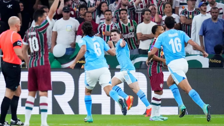 Este viernes, el Manchester City se coronó campeón del Mundial de Clubes al vencer por 4 a 0 a Fluminense en la final celebrada en Arabia Saudita. La actuación determinante de Julián Álvarez, quien inició el partido como titular, resultó fundamental. El jugador argentino marcó el camino hacia la victoria al anotar un gol de pecho al comienzo del encuentro y selló el triunfo con otro tanto espectacular al final del mismo.
